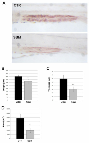 We also analyzed the intramembranous ossification in the trunk focusing on vertebral mineralization (Figure 5A). CTR larvae showed an average of eight mineralized vertebrae at 9 dpf while SBM vertebral mineralization results almost halved (SBM vs. CTR, −43%, p < 0.001, Figure 5B). Total lengths of the larval body were taken to verify the normal general development of the body (Figure 5C) and were used to calculate a normalized index of vertebral mineralization (number of vertebrae/total body length, N.V./L.), thereby confirming the decreased SBM vertebral mineralization rate (SBM vs. CTR, −47%, p < 0.001, Figure 5D).