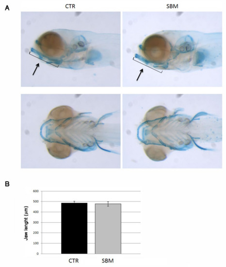 Head of zebrafish embryos stained with alcian blue. (A) Cartilage structures of CTR and SBM embryos visualized as lateral view (upper panel) and bottom view (lower panel). Black arrow indicates the jaw. (B) Length of jaw in CTR and SBM embryos. The measure was performed as indicated by black arrow in upper panel of A. Data derived from 10 CTR and 10 SBM larvae, with tests performed 3 times as independent experiments with comparable results. No significant difference was detected using the Student t-test.