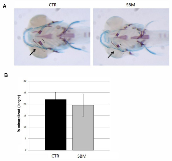 To test endochondral mineralization, we performed double staining with alizarin red and alcian blue and we measured cerathoyal bone mineralization in the head. A slight slowdown of cerathoyal endochondral mineralization was detected in SBM larvae (Figure 3A) even if not statistically significant (SBM vs. CTR, −11%, Figure 3B).