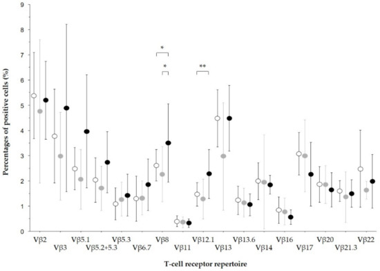 - Seo, K.S.; Park, J.Y.; Terman, D.S.; Bohach, G.A. A quantitative real time PCR method to analyze T cell receptor Vbeta subgroup expansion by staphylococcal superantigens. J. Transl. Med. 2010, 8, 2. [Google Scholar] [CrossRef] [PubMed]