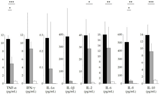 Serum cytokine levels in SAGN with IgA-dominant deposition. Sera were obtained from patients with SAGN S. aureus-infected patients without glomerulonephritis and healthy controls, and the following 10 cytokines were measured by enzyme-linked immunosorbent assays: IL-1α, -1β, IL-2, IL-4, IL-6, IL-8, IL-10, TNF-α, TNF-β, and INF-γ [9,10,11,12,13]. The serum levels of eight cytokines are shown. Black closed bars: the mean levels of cytokines in patients with SAGN. Gray closed bars: the mean levels of cytokines in S. aureus-infected patients without glomerulonephritis. Open bars: the mean levels of cytokines in healthy controls. Bars: the standard deviation. Serum levels of IL-2, IL-6, IL-8, IL-10, and TNF-α in the patients with SAGN were significantly higher compared to those in the controls, and serum levels of IL-8 and TNF-α in the patients with SAGN were significantly higher compared to those in patients without glomerulonephritis (* p < 0.05; ** p < 0.01; *** p < 0.001). Serum IL-4 and TNF-β were not detected in all three groups.