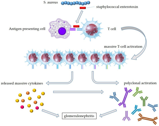 Hypothesis of pathogenesis in SAGN with IgA-dominant deposition. Staphylococcal enterotoxins produced by S. aureus bind to specific TCR-Vβ on T cells and the outer part of the MHC molecules without being processed. Bacterial superantigens lead the MHC-unrestricted huge T-cell activation. The subsequent excessive release of cytokines activates not only T cells but also B cells; the polyclonal immunoglobulin production leads to the formation of immune complexes, resulting in the onset of SAGN. S. aureus—Staphylococcus aureus.