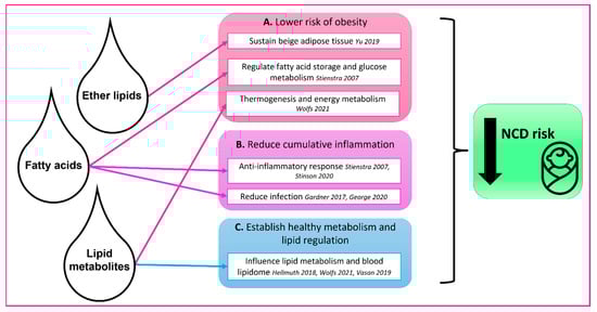 Summary of the possible roles of bioactive human milk lipids and lipid metabolites in protecting the infant against non-communicable disease risk. Lipids and lipid metabolites are delivered to the infant early in life through human milk and contribute to (A) lower risk of obesity, (B) reduction in cumulative inflammation, and (C) establishment of healthy metabolism and lipid regulation. Arrows indicate identified associations between human milk components and infant protection, as per the literature. Key articles included in the review are referenced [7,13,15,16,17,18,19,20].