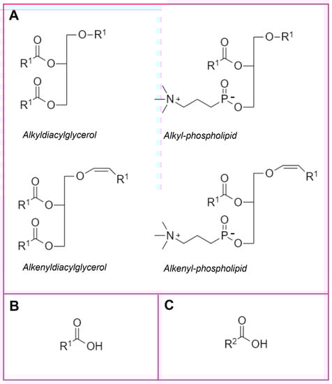 Ether lipids (Figure 2A) are a group of glycerol- or glycerophospho- lipids that contain an ether or vinyl ether linkage in the sn-1 position of the glycerol backbone, including alkylglycerols and plasmalogens. In humans, dietary alkylglycerols can be metabolised to plasmalogens, through a complex process involving alkylglycerol kinase, gastric lipase and pancreatic lipase. Plasmalogens are a highly bioactive ether lipid and are critical in human health due to their many biological functions. They are structural components of cells, potent antioxidants, and are critical to the differentiation of monocytes to macrophages, potentially modulating inflammatory processes. Plasmalogens also regulate cholesterol biosynthesis and efflux, and act as lipid mediators, providing a source of polyunsaturated fatty acids for subsequent production of eicosanoids and prostaglandins [46]. In adults, plasmalogens are altered in several disease states, reduced in obesity, type 2 diabetes and coronary artery disease [47,48,49].