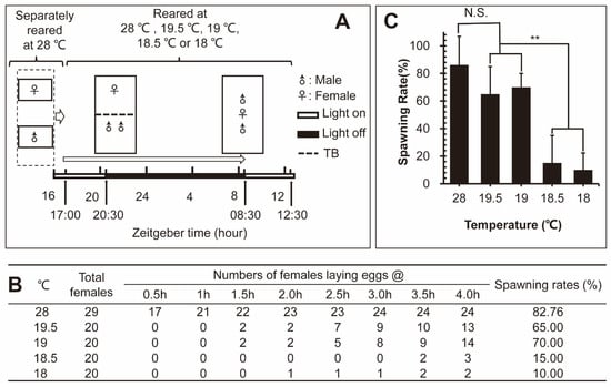 The fecundity of the zebrafish at different temperatures. (A) The schematic diagram for the fecundity of the zebrafish experimental process. (TB: transparent baffle). (B) The number of spawning zebrafish increased over time and spawning rates of female zebrafish at different temperatures. (C) Comparison of female spawning rates at different temperatures. (** p < 0.01; N.S.: no significance).