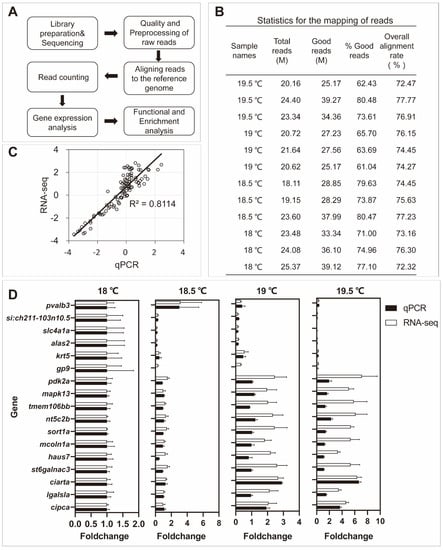 The workflow of RNA−seq data analysis. (A) Main steps of RNA−seq data analysis in the study. (B) Statistics for mapping of reads in four groups. The sample names used the experimental temperatures. Temperatures at 19.5 °C and 19 °C are egg-spawning groups and temperatures at 18.5 °C and 18 °C are non-spawning groups. (C) Validation of RNA−seq data with quantitative RT−PCR (qPCR). Log2 fold changes of RNA−seq data for gene expression were plotted against those of qPCR data. The reference straight line in black indicates the linear relationship between the results of RNA−seq and qPCR. (p < 0.00001, correlation coefficient = 0.8114). (D) Fold changes and standard error of mean (SEM) for 17 selected genes of RNA−seq were validated with qPCR.