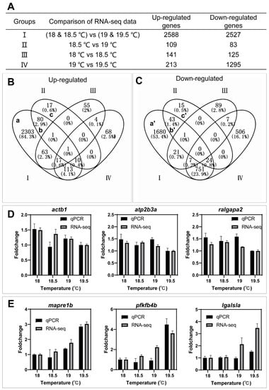 Identification of key genes associated with the spawning of females using Venn diagram. (A) The number of differentially expressed genes between groups of different temperatures (fold change ≥ 1.5 and p-value ≤ 0.05). (B) Up-regulated genes in different Venn groups to identify key genes between non-spawning and egg-spawning groups I and II (a, b, and c). (C) Down-regulated genes in different Venn groups to identify key genes between non-spawning and egg-spawning groups I and II (a’, b’ and c’). (D) Validation of RNA-seq data by qPCR for three genes from the group of up-regulated genes in groups I and II (a, b, and c). (E) Validation of RNA-seq data by qPCR for three genes from the group of down-regulated genes in groups I and II (a’, b’ and c’).