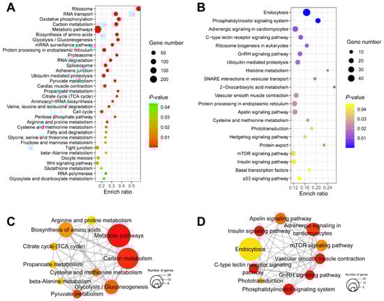 Hub signaling pathways from KEGG enrichment analysis of up- and down-regulated key genes. (A) Dot plot of KEGG signaling pathways for up-regulated key genes. (B) Dot plot of KEGG signaling pathways of down-regulated key genes. (C) Network of top 10 hub pathways for up-regulated key genes. (D) Network of top 10 hub pathways for down-regulated key genes. Nodes represent pathways and edges represent Jaccard similarity coefficients. Node color and size stand for the enrichment p-value and the number of genes in the pathway, respectively.