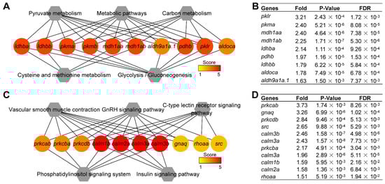 Hub genes within the top five hub pathways. (A) Network of 10 hub genes mapped to top five hub pathways enriched from up-regulated key genes. (B) The fold change of up-regulated hub genes in group I. FDR: false discovery rate (C) Network of 10 hub genes mapped to top five hub pathways enriched from down-regulated key genes. (D) The fold change of down-regulated hub genes in group I. Round stands for genes; hexagon represents pathways; edge means the gene mapped to the pathway in (A,C).