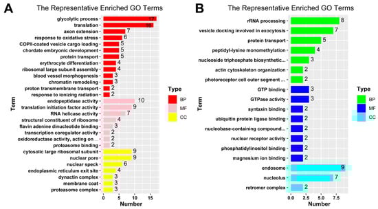 GO analysis indicated that the most representative GO terms were the glycolytic process for up-regulated key genes and rRNA processing for down-regulated key genes. There were 17 GO terms related to glycolysis enriched under cold stress in the non-spawning group and the mRNA level of genes encoding proteins in the energy metabolism cascades were up-regulated. Glycolysis is a metabolic pathway that converts glucose into pyruvic acid to release free energy []. Previous studies have reported that cellular ATP and ADP concentrations increased with decreasing temperature [,]. These biological processes appear to be closely associated with acclimation of fish under cold stress.
