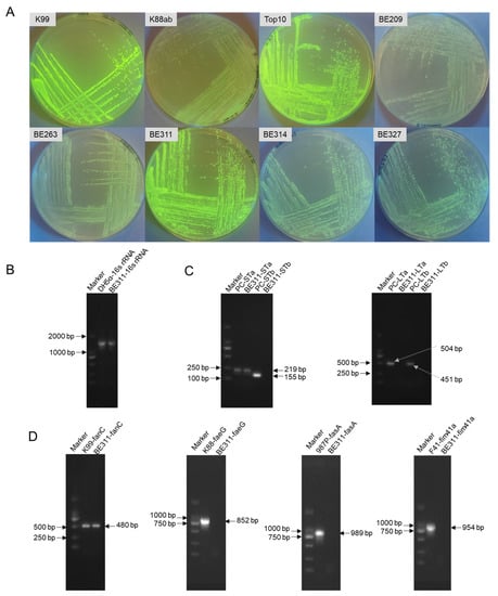 Identification and characterization of E. coli BE311. (A), The expression of pQE30-GFP in different E. coil strains. (B), PCR amplification of the 16S rRNA of E. coli BE311. (C), Identification of the enterotoxins in E. coli BE311 by agarose gel electrophoresis (AGE). (D), Identification of the adhesions in E. coli BE311 by AGE.