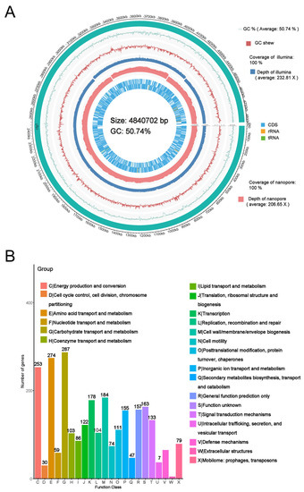 The whole genome sequencing showed that the chromosome of E. coli BE311 was 4,840,702 bp (50.74% G + C content) long and encoded 4622 genes (Figure 2A) annotated to Refseq. The whole genome sequence of the E. coli BE311 chromosome was deposited in GenBank with the Accession Number SUB11437696. The complete sequence of E. coli BE311 was compared to the VFDB database to identify potential virulence factors. The E. coli BE311 chromosome encodes a variety of potential virulence factors (Supplementary Table S1), including adhesions, toxins, and invasion proteins. Overall, 1364 candidate pseudogenes were identified in the E. coli BE311 genome, and the total length of the predicted pseudogenes was 323,478 bp (Supplementary Figure S1).