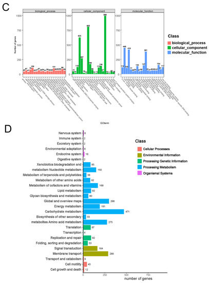The filtered reads from Hiseq were assembled with Assembler1.2. The genome was annotated and open reading frames (ORFs) identified using Prokka and/or PATRIC 3.6.5 with default settings. The WGS data sets were analyzed using an open-access bioinformatics webtool available at the Center for Genomic Epidemiology (http://www.genomicepidemiology.org/ (accessed on 6 March 2019) ). Serotype Finder 2.0 was used for in silico typing based on the WGS of the assembled genomes/contigs in FASTA format, with a threshold of 90% identity and a 60% total serotype gene length. Virulence genes were identified using Virulence Finder 2.0 with thresholds of 90% identity and 60% minimum length. Virulence genes were aligned to the VFDB database (http://www.mgc.ac.cn/VFs/main.htm). Clustered regularly interspaced short palindromic repeats (CRISPRs), genomics islands (GIs), and pseudogene candidates and prophages were determined by CRISPRfinder (https://crispr.i2bc.paris-saclay.fr/), IslandViewer 4 (http://www.pathogenomics.sfu.ca/islandviewer/), and Pseudofinder, respectively (All the websites in this section were accessed on 3–8 April 2021). The functions of the identified genes were divided into three categories: cell composition, molecular function, and biological process. The top 20 enriched GO slims with the most genes under each category were selected for plotting. After KEGG annotation, the genes were classified according to their associated KEGG metabolic pathways.