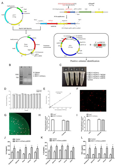 Expression and analysis of mCherry in BE311. (A), The process of knocking mCherry into BE311 based on CRISPR/Cas9. (B), Agarose gel electrophoresis detection of the mCherry in BE311 genome. (C), Red fluorescence expression in different strains with or without lactose inducement. (D), Stability analysis of BE311–mCherry–pQE30 with or without ampicillin. (E), Construction of the correlation curve between fluorescence intensity and concentration of BE311–mCherry–pQE30. (F), The fluorescence of E. coli BE311–mCherry–pQE30 captured under fluorescence microscope. (G–I), The gut microbiota of E. coli BE311–mCherry–pQE30-challenged mice was obtained and cultured in LB plate for 24 h. The fluorescence of colonies and bacteria in intestines (H,I) was identified under blue exciting light and fluorescence microscope. (J–L), The expression of IL-6, IL-8, and TNF-α in different intestines of E. coli BE311–mCherry–pQE30-challenged SD rats. Statistical significance was determined using Students’ t test. * p < 0.05, ** p < 0.01, *** p < 0.001.