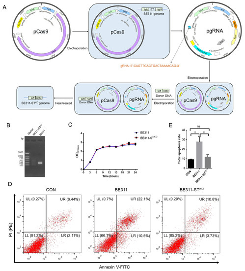 Construction and analysis of BE311-STKO. (A), The knock-out process of ST gene in BE311. (B), Amplification of ST gene in wild-type and ST-knock-out BE311 strains. (C), The growth curve of BE311 and BE311-STKO strains within 24 h. (D), IPEC-J2 cells were challenged with BE311 or BE311-STKO for 6 h. Then the cellular apoptosis was examined by flow cytometry. (E), The total apoptosis rate in IPEC-J2 cells challenged with BE311 or BE311-STKO for 6 h. ** p < 0.01, ns, no significant difference.