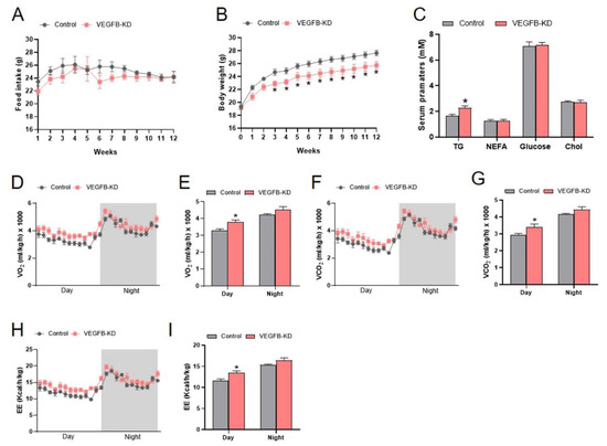 Knockdown of VEGFB decreased body weight and increased energy expenditure of mice. (A) The food intake of mice after AAV injection. (B) The body weight of mice after AAV injection. (C) The serum parameter concentrations of mice (TG: triglyceride, NEFA: non-esterified fatty acid, and Chol: cholesterol). (D,E) The volumes of O2 consumption (VO2) and statistics of mean VO2 of mice in a day and night cycle. (F,G) The volumes of exhaled CO2 (VCO2) and statistics of mean VCO2 of mice in a day and night cycle. (H,I) The energy expenditure (EE) and statistics of mean EE of mice in a day and night cycle. Grey areas indicate night periods. Each group contains 6 mice, values are presented as mean ± SEM, * p < 0.05 versus control group.