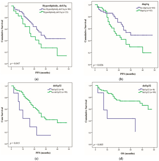 The association between del17p and del13q was found in two cases, showing a negative impact on the median PFS (6 months) (p = 0.005) and for OS (7 months) (p = 0.011) [38].