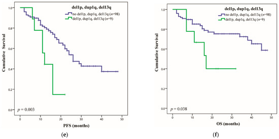 Concerning the second most common chr loss, namely del1p (n = 23, patients with at least two probes from nine deleted in this region), the region 1p21 was the most frequently affected, in 91.3% of cases (n = 21/23), while whole (or almost whole) arm deletion was present in only 34.7% of them (n = 8/23). The poorest prognosis in this group was conferred by del1p32 (7.5% cases), as mentioned by Hebraud et al., 2014 [36], with a median PFS of 10 months (p = 0.015) (Figure 1c) and median OS of 10 months (p = 0.005) (Figure 1d). A group of del1p patients also had HRD (56.5%) and/or del13q (47.8%). Association between del1p and dup1q was found in 12 samples (27.9% of dup1q positive group), 9 of which also presenting del13q and having a poor prognosis, with a median PFS of 12 months (p = 0.003) and median OS of 17 months (p = 0038) [37] (Figure 1e,f).