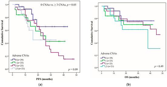 In terms of the CNA accumulation impact, it seems that the association of at least three adverse alterations had the greatest impact on PFS, with a median duration of 16 months (n = 21), compared with patients without adverse CNAs (PFS greater than 48 months) (p = 0.05) (Figure 2a). The OS was lower only in the case of patients with at least three adverse DNA alterations (38 months), whereas the rest of the patients exceeded the study timeline (Figure 2b). In the group without adverse CNAs (n = 29), only patients with no genetic alterations were included (thus seven patients who had only HRD without other adverse CNAs were excluded). The presented results are consistent with the data presented previously by other studies [39,40,41].