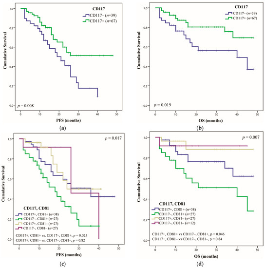 The expression of the CD117 marker was documented as a positive prognostic factor [22], and this was also observed by our group. Thus, it was identified in 67 patients and had a favorable impact for PFS (more than 48 months, p = 0.008) and OS (more than 48 months, p = 0.019) (Figure 3a,b). CD117 expression also improved the outcome of patients who expressed CD81(+), thus, the median PFS increased from 18 months to 36 months in cases of CD117(+) CD81(+) vs. CD117(−) CD81(+) (p = 0.025, HR 0.48 (95% CI 0.23–0.90)) and the median OS from 40 months to more than 48 months (p = 0.046, HR 0.44 (95% CI 0.19–0.99). There was no difference in the PFS or OS within the CD81(−) group with or without CD117 expression (p = 0.82/p = 0.84) (Figure 3c,d).