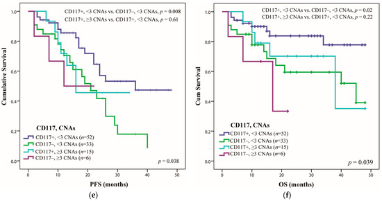 Next, an association analysis was performed for CD117 with at least three adverse CNAs. CD117 expression had a positive impact in the group of fewer than three CNAs. Thus, in this group, the CD117 expression increased the PFS from 21 to 36 months (p = 0.008) and OS from 45 to over 48 months (p = 0.02) (Figure 3e,f). In the group with more than three CNAs, the expression of CD117 showed no statistical significance, maybe due to the low number of patients in this group.