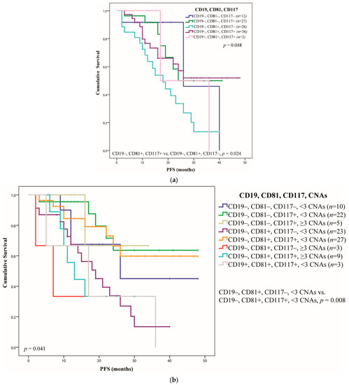 When we analyzed the PC groups with both adverse lesions and CD117 expression, relevant results were obtained only for the CD19(−) CD81(+) group. Thus, CD117 expression had a positive prognostic value when less than three adverse CNAs were identified.