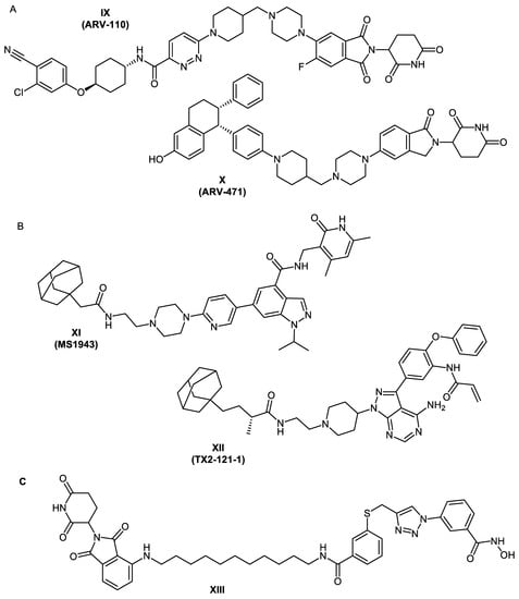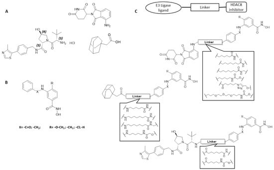 (A) First PROTACs to enter in-human clinical trials (https://www.guidetopharmacology.org (accessed on 1 March 2022)). (B) Examples of reported bifunctional hydrophobically tagged molecules. (C) Reported HDAC8 PROTAC.