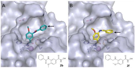 Predicted binding mode of (A) 2b (colored cyan) and (B) 2f (colored yellow) in human HDAC8 (PDB ID: 6ODB). The arrow indicates the point of linker attachment (p-position of the terminal phenyl ring).