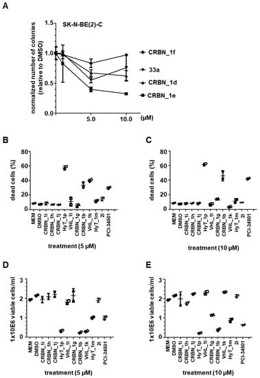 Moreover, we treated neuroblastoma IMR-32 cells with the remaining PROTACs and counted the resulting viable cells. We quantified the percentage of dead cells as shown in (Figure 5B,C). In addition, cell proliferation was assessed via counting of viable cells (Figure 5D,E). The CRBN_ PROTAC CRBN_1b and the HyT_ degrader HyT_1p significantly decreased the ability to form colonies at 5 and 10 µM concentrations and showed also the strongest effect in the cell proliferation assay. In case of VHL_1k and HyT_1m the results were less significant, whereas the remaining PROTACs were all found to be inactive. As reference, the HDAC8 inhibitor PCI-34501 was used [].