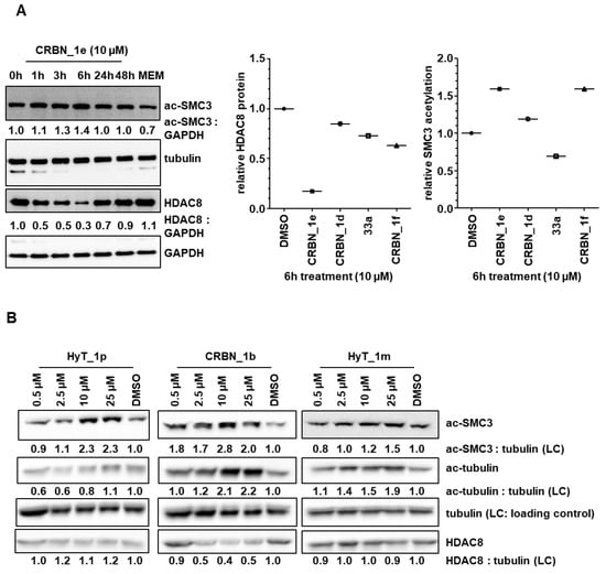 To test the degradation of HDAC8 with the developed PROTACs, we selected the most promising compounds obtained from the cellular neuroblastoma testing; namely CRBN_1b, CRBN_1d, CRBN_1e, HyT_1m, and HyT_1p. Whole cell lysates from treated SK-N-BE(2)-C neuroblastoma cells were taken and the protein levels for HDAC8 and the acetylation of its substrate SMC3 were determined (Figure 6). As a control for HDAC6, we also assessed acetylation levels of α-tubulin. It revealed that 6 h treatment and a concentration of 10 µM gives the highest degradation of HDAC8 for the CRBN_ based PROTACs CRBN_1b and CRBN_1e in SK-N-BE(2)-C cells (Figure 6A–C). The CRBN_ PROTAC CRBN_1b resulted in 40% remaining HDAC8 protein whereas CRBN_ PROTAC CRBN_1e reduced HDAC8 down to 30% protein level. A clear dose-dependent degradation of HDAC8 by PROTAC CRBN_1e was observed (Figure 6C). After 48 h, the HDAC8 protein level was back to baseline, presumably due to de novo protein synthesis. To stop this effect, in another experiment the de novo protein synthesis inhibitor cycloheximide was used at low concentration (35 nM) together with the PROTAC CRBN_1e (10 μM). By inhibiting the de novo synthesis, HDAC8 degradation of CRBN_1e was still significant after 24 h, whereas cycloheximide alone showed no effect (S7, Supplementary Materials).
