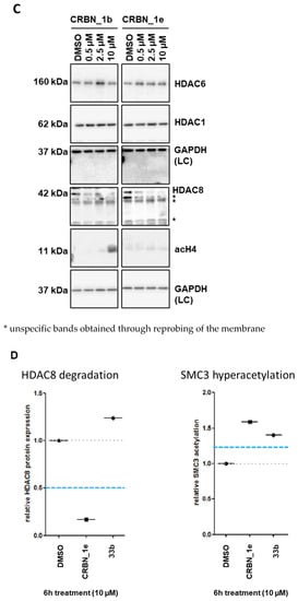 Both PROTACs also showed a strong hyperacetylation of the HDAC8 substrate SMC3. As expected, the negative control 33a (bearing a carboxyl ester instead of the hydroxamic acid) did not show hyperacetylation of SMC3 or HDAC8 degradation. Furthermore, the CRBN_ PROTAC CRBN_1d, and the HyT_ PROTACs HyT_1m and HyT_1p failed to degrade HDAC8 in this neuroblastoma cell line (Figure 6A,B). We also tested the most potent PROTACs CRBN_1b and CRBN_1e to see whether or not they are able to degrade HDAC1 or HDAC6 (Figure 6C and Figure S8, Supplementary Materials). PROTAC CRBN_1e showed no significant effect at the highest concentration of 10 µM. Thus, the active HDAC8 degraders CRBN_1b and CRBN_1e are selective and do not degrade HDAC1 and HDAC6. As a further negative control, we used 33b to measure HDAC8 degradation. 33b is an analog of PROTAC CRBN_1e without the pomalidomide warhead (benzyl group instead). 33b is a HDAC8 inhibitor with an IC50 of 698 ± 41 nM and showed hyperacetylation of SMC3 but no HDAC8 degradation when tested at 10 μM concentration (Figure 6D). Therefore, we assume that HDAC8 degradation can only be achieved by linking a CRBN ligand and a benzhydroxmate based HDAC8i as in case of CRBN_1b and CRBN_1e.