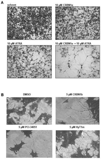 As HDAC8 inhibition is known to induce signs of neuronal differentiation, such as neurite-like outgrowths in neuroblastoma cells []), we treated SK-N-BE(2)-C cells with CRBN_1b, CRBN_1e, HyT_1m, and PCI-34051 for 6–10 days then stained the cells with crystal violet to visualize neurite-like outgrowths. For comparison, we treated the cells with the known neuronal differentiation inducer retinoic acid (ATRA) which is a known drug, that is applied for neuroblastoma treatment under some circumstances. We also combined one PROTAC—namely, CRBN_1e—with ATRA, which substantially enhanced the differentiation phenotype (Figure 7). These results are in line with the published differentiation enhancement effect (longer outgrowth, more cells with outgrowth in combination) of HDAC8 inhibitors such as PCI-34051 [].