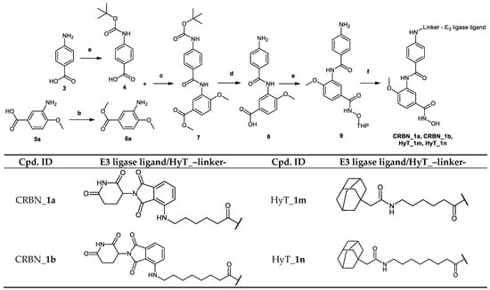 The synthesis of the PROTACs (CRBN_1a, CRBN_1b, HyT_1m and HyT_1n) is elucidated in Scheme 1. After 4-((tert-butoxycarbonyl) amino)benzoic acid (4) was prepared as previously reported [], it was reacted with methyl 3-amino-4-methoxybenzoate (6a) following Method IIIA (see Materials and Methods part) to yield methyl 3-(4-((tert-butoxycarbonyl)amino)benzamido)-4-methoxybenzoate (7). Next, the methyl ester group was hydrolyzed using Method IIA (see Materials and Methods part) and the tert-butyloxycarbonyl protecting group was removed using Method VI (see Materials and Methods part) to yield 3-(4-aminobenzamido)-4-methoxybenzoic acid (8). To complete the synthesis of the 2-tetrahydropyranyl-protected HDAC ligand (9), O-(tetrahydro-2H-pyran-2-yl) hydroxylamine was reacted with the free carboxylic acid group following Method IIIA (see Materials and Methods part). The 2-tetrahydropyranyl protected PROTACs were synthesized by reacting the different E3 ligase ligand-linker-COOH (43a,b) or HyT-linker-COOH (47a,b) (see Scheme S4.1 in Supplementary Material) with the 2-tetrahydropyranyl-protected HDAC ligand (9) as stated in Method IIIA (see Materials and Methods part). Finally, deprotection according to the Method V (see Materials and Methods part) took place to obtain the free hydroxamic acid containing PROTACs (CRBN_1a, CRBN_1b, HyT_1m and HyT_1n).