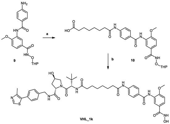 In Scheme 2, the synthesis of PROTAC (VHL_1k) is shown. First, the 2-tetrahydropyranyl-protected HDAC ligand (9) was synthesized as previously indicated in Scheme 1. Next, suberic acid was attached to the protected ligand following Method IIID to yield 8-((4-((2-methoxy-5-(((tetrahydro-2H-pyran-2-yl)oxy)carbamoyl)phenyl) carbamoyl)phenyl)amino)-8-oxooctanoic acid (10). Then the formed conjugate was reacted with the VHL ligand (40) (see S3 in Supplementary Material) using Method IIIA (see Materials and Methods part) to give the protected PROTAC which was deprotected according to Method V (see Materials and Methods part).