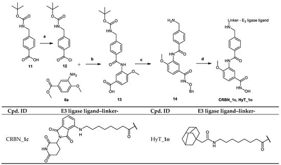 The synthesis of the PROTACs (CRBN_1c and HyT_1o) is shown in Scheme 3. According to Method IIIB, compound 3-(4-(((tert-butoxycarbonyl)amino) methyl)benzamido)-4-methoxybenzoic acid (13) was synthesized starting from 4-(((tert-butoxycarbonyl)amino)methyl)benzoic acid (11) and methyl 3-amino -4-methoxybenzoate (6a). Tert-butyl (4-(chlorocarbonyl)benzyl)carbamate (12) was prepared in accordance to a previously reported method []. The methyl ester was hydrolyzed according to Method IIA (see Materials and Methods part) to obtain the free carboxylic acid which was reacted with O-benzylhydroxylamine hydrochloride according to Method IIIA (see Materials and Methods part). Next, the tert-butyloxycarbonyl protecting group was removed using Method VI (see Materials and Methods part) to give the benzyl protected HDAC ligand (14). The PROTAC synthesis was completed by reacting the E3 ligase ligand-linker-COOH (43b) or HyT-linker-COOH (47b) (see Scheme S4.1 in Supplementary Materials) with the protected HDAC ligand (14) using Method IIIA followed by removing the benzyl group according to Method VII (see Materials and Methods part) to obtain the free hydroxamic acid.