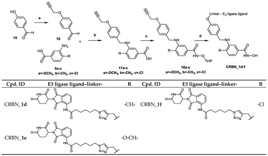 In Scheme 4, the synthesis of PROTACs (CRBN_1d–f) is presented. To prepare 4-substituted-3-{[4-(proparg-1-yloxy)benzyl]amino}benzoic acid (17a–c), 4-proparg-1-yl oxybenzaldehyde (16) and the corresponding amine (5a–c) were reacted according to Method IA. Afterwards, the 2-tetrahydropyranyl-protected HDAC ligands were prepared by reacting the free carboxylic acid in (17a–c) with O-(tetrahydro-2H-pyran-2-yl)hydroxylamine following Method IIIA (see Materials and Methods part). Next, these HDAC ligands (18a–c) were linked to the E3 ligase ligand–linker-N3 (50) (see Scheme S4.2 in Supplementary Materials) via the azide-alkyne Huisgen cycloaddition as stated in Method IV (see Materials and Methods part). Finally, the free hydroxamic acids were obtained by removing the 2-tetrahydropyranyl group following Method V (see Materials and Methods part).