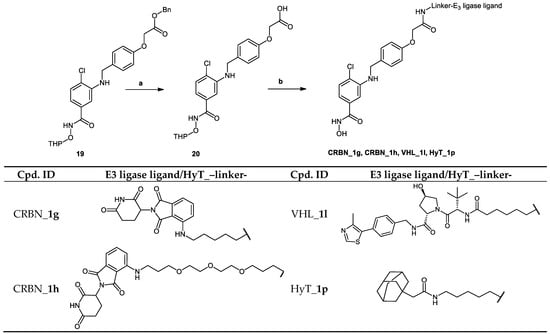 In Scheme 5, the synthesis of PROTACs (CRBN_1g, CRBN_1h, VHL_1l and HyT_1p) is shown. Benzyl 2-(4-(((2-chloro-5-(((tetrahydro-2H-pyran-2-yl)oxy)carbamoyl)phenyl) amino)methyl)phenoxy) acetate (19) was synthesized as shown in Scheme S1.2 in Supplementary Materials. Afterwards the benzyl protecting group was removed according to Method VII (see Materials and Methods part) to yield the 2-tetrahydropyranyl protected HDAC ligand (20), which was reacted with E3 ligase-linker-NH2 conjugates (53, 56, 59) or HyT-linker-NH2 (57) (see Scheme S4.3 in Supplementary Materials) via Method IIIA (see Materials and Methods part). Finally, the protected PROTACs were deprotected using Method V (see Materials and Methods part) to yield the final PROTACs.