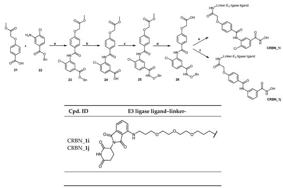 Reagents and conditions: (a) (1) SOCl2, reflux, (2) DIPEA, THF; (b) Pd/C (5%), H2, EtOAc: THF (1:1); (c) DIPEA, HATU, NH2OBn·HCl, DMF, room temperature; (d) LiOH, H2O: THF (1:1), room temperature; (e) (1) E3 ligase ligand-linker-NH2 53 (see Scheme S4.3 in Supplementary Materials), HATU, DIPEA, DMF; (2) H2, Pd/C (5%), MeOH. (f) (1) E3 ligase ligand-linker-NH2 53 (see Scheme S4.3 in Supplementary Materials), DIPEA, HATU, DMF; (2) H2, Pd/C (10%), MeOH.