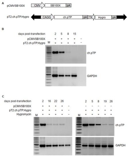 Transposition of ch.pTP in HEK293 cells. (A) Schematic outline of the plasmids carrying transposon or transposase. pCMVSB100X carries the SB100X transposase coding sequence under the control of cytomegalovirus (CMV) promoter. The pT2.ch.pTP.Hygro transposon plasmid carries the expression cassettes for ch.pTP, under the control of the hybrid CAGGS promoter, and a second expression cassette for the Hygromycin resistance gene (Hygro), driven by Herpes Simplex Virus Thymidine Kinase (TK) promoter. Black arrows indicate T2 IR. pA, polyadenylation signal. (B) PCR amplification of a fragment (489 bp) of ch.pTP and, as control, GAPDH in the genomic DNA from HEK293 cells co-transfected with pCMVSB100X and pT2.ch.pTP.Hygro plasmids. (C) PCR amplification of a fragment (489 bp) of ch.pTP and, as control, GAPDH in the genomic DNA from HEK293 cells transfected with pT2.ch.pTP.Hygro plasmid in presence (left panel) or absence (right panel) of pCMVSB100X and selected with Hygromycin. M, 100 bp molecular weight marker.