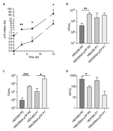 Transcript of ch.pTP and chAd-C vector produced in HEK293ch.pTP and HEK293 cells. (A) Real Time PCR analysis of ch.pTP transcript produced during the packaging of a chAd-C vector at P0 in HEK293ch.pTP cells (full circle) compared to HEK293 cells (empty triangle). The amount of ch.pTP mRNA was analysed from 3 dpt up to full cytopathic effect (15 dpt) in three independent experiments. (B) VP/mL and (C) TU/mL titration of chAd-C Venus vector rescued (P0) and propagated (P1) in HEK293 (n = 3) and in HEK293ch.pTP cells (n = 4). (D) Ratio VP/TU as a parameter of the quality of chAd-C vector rescued (P0) and propagated (P1) in HEK293 and HEK293ch.pTP cells. The data are reported as mean ± SD. *** p < 0.001; ** p ≤ 0.01; * p < 0.05.