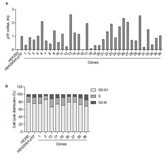 Molecular and cellular analysis of clones isolated from the HEK293ch.pTP bulk. (A) RTqPCR to assess the expression of ch.pTP in 34 clones compared to the HEK293ch.pTP bulk. As a negative control, ch.pTP expression in HEK293 cells was measured. The expression of GAPDH was used for normalization. (B) Cell cycle analysis by flow cytometry. The percentage of cells in each stage of the cell cycle (G0/G1, S, and G2/M) scored in HEK293, HEK293ch.pTP bulk and clones #1, #2, #13, #17, #25, #26, #27, #30 and #36 cultured for 7 days is indicated.