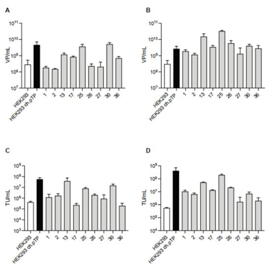 ChAd-C vector produced in HEK293ch.pTP clones. Titration of chAd-C Venus vector in terms of VP/mL and TU/mL rescued (P0, (A,C)) and propagated (P1, (B,D)) in HEK293, HEK293ch.pTP cells and nine isolated clones. Mean with standard deviation (n = 2) is presented.