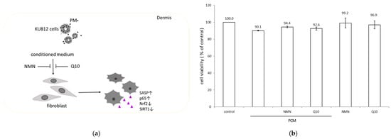 (a) Schematic depicting the experimental design. (b) Effect of PCM-conditioned medium, NMN and Q10 on HDF viability measured using the MTS Assay. All treatments were tested in triplicate, and the mean values ± SEM are shown.