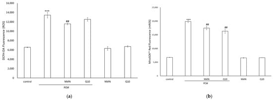 Representative levels of (a) intracellular ROS and (b) mitochondrial ROS (mROS) in HDFs treated with PCM or in combination with NMN or Q10. Data represent the mean ± SD of three independent experiments. *** p < 0.01 as compared with untreated control and ## p < 0.01 as compared with PCM.