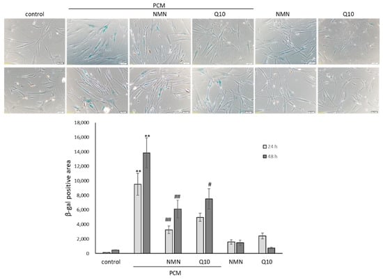 Altered cellular oxidative status is able to promote stress-induced premature senescence, as documented by a dose-dependent increase in β-gal positivity. Following incubation with PCM, a significant increase in ROS levels was observed, indicating increased cellular oxidative status as a consequence of impaired mitochondrial functionality. Accumulated intracellular oxidative stress is critical in steering cellular biochemical pathways toward adaptive antioxidant defenses such as the Nrf2 response or cellular dysfunction. After exposure to NMN or Q10, we observed a significant decrease in mitochondrial superoxide production as well as a decline in the accumulation of cellular ROS. Similarly, in our presented experimental model, attenuated oxidative stress also significantly reduced the levels of β-gal formation.
