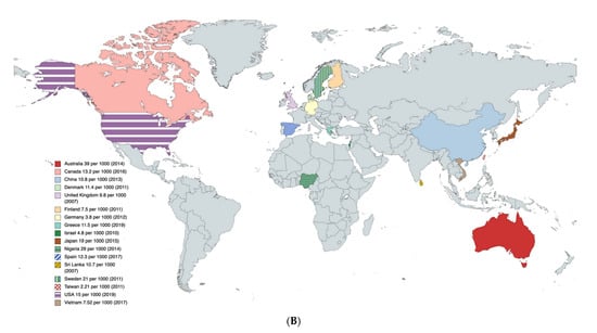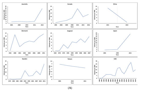 The worldwide prevalence of ASD is estimated to be close to 1.5% [2,3,4,5]. ASD prevalence varies depending on the year and the country dataset. Figure 1 was designed using the results of existing ASD datasets (https://data.cdc.gov/Public-Health-Surveillance/autism-prevalence-studies/9mw4-6adp, accessed on 20 April 2022). Figure 1A shows that, in general, the highest prevalence was observed in Australia (39 per 1000), followed by Sweden (21 per 1000) and Japan (19 per 1000), and a lower prevalence was observed in Taiwan (2.21 per 1000). In Figure 1B, it can be seen that prevalence has been increasing recently in some countries, such as Australia (from 3.92 per 1000 in 2002 to 39 per 1000 in 2014), Japan (from 1.55 per 1000 in 1983 to 19 per 1000 in 2015), the USA (from 0.33 per 1000 in 1985 to 15 per 1000 in 2019), and Denmark (from 0.43 per 1000 in 1962 to 11.4 per 1000 in 2011). These data suggest that external factors such as mode of life and industrialization may have affected individual behaviours and could play a role in ASD occurrence. However, prevalence rates may vary because of differences in diagnostic procedures and reliability across countries, regions, and time frames.