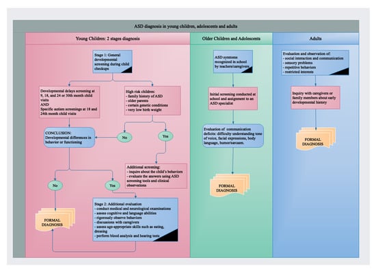 ASD is diagnosed by evaluating behaviour and development. Although diagnosis can be performed at any age, it is better to diagnose ASD by the age of two, and treatments can be started earlier for better efficacy [6,23,24]. Figure 2 presents a summary of ASD diagnosis, depending on the developmental stage.