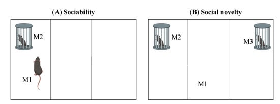 The social approach test evaluates sociability and preference for novel society and is adapted to detect behavioural characteristics of ASD in mouse models [65,66,67,68]. As shown in Figure 4, the apparatus is usually made of Plexiglass and consists of three chambers (~20 × 40 cm per chamber). The test is performed in three phases. In phase 1, the three chambers are separated, and a mouse, M1, is placed in the middle of the chamber and allowed to habituate to the apparatus. After 5 min, a new mouse, M2, unfamiliar to mouse M1, is placed in a small metal cage and introduced into one of the two side chambers. An identical empty small metal cage is placed next to the adjacent side chamber, and the chamber separators are removed. In phase 2, mouse M1 is allowed to move freely for 10 min. The duration of time that it spends in the chamber containing mouse M2 and the duration of time it spends oriented towards the cage with its nose pointing less than 2 cm from it is recorded. In phase 3, a new mouse, M3, is placed into the previously empty cage. Mouse M1 is allowed to freely explore the apparatus for 10 min. The duration of time spent in contact or oriented towards the new cage containing mouse M3 compared to the cage with mouse M2 is also recorded [65,66,67,68]. A reduction in sociability time is associated with an ASD phenotype.