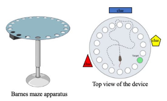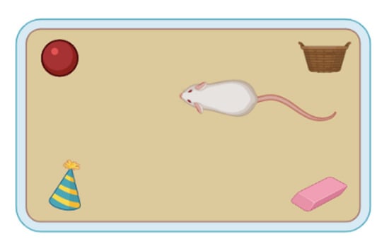 In the repetitive novel object test (Figure 5), mice are evaluated for the frequency of repetitive contact with novel objects. On Day 1 of the test, mice are introduced to the experimental room and left undisturbed for a 30 min habituation period. The next day, the animals are individually placed in an identical clean cage containing fresh sawdust bedding as well as four novel objects (small children’s toys) located approximately 4 cm from each of the four corners. Close contact with or burying of the novel objects is recorded during a 10-min session test. The occurrence of repetitive contact with three and four toys, the frequency of times that the mice buried each object, the total frequency of contact with each of the toys, and the total number of burying episodes are calculated [71,72]. Restricted and increased repetitive behaviours are a core feature of ASD.