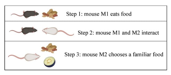 | Communication | Social transmission of food preference test [68] Impaired vocalization test [80,81] | Not available to date | |